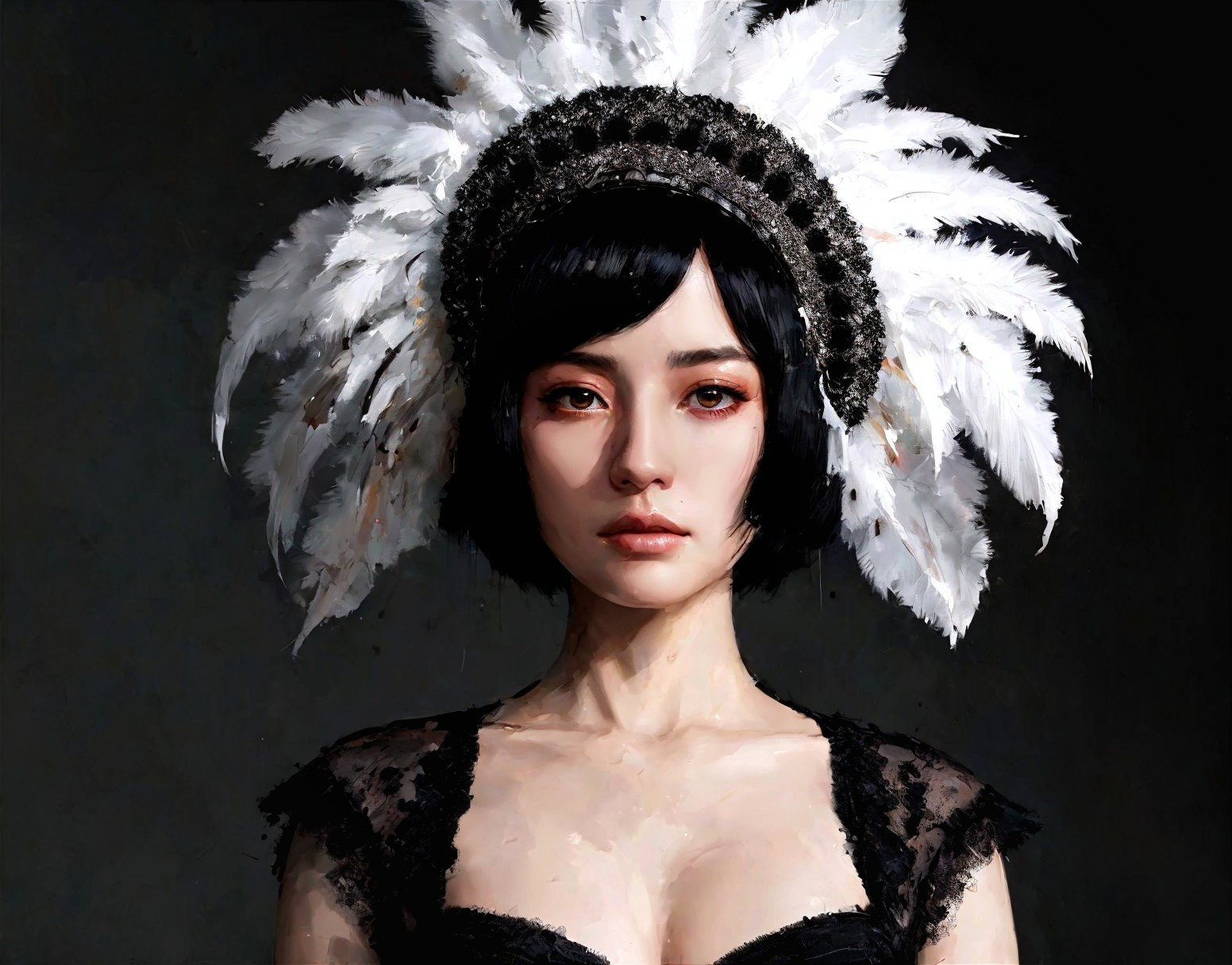 "Try it" from Enigmatic Beauty in Feathers https://deepdreamgenerator.com/ddream/crqaxp8xdp9 - A painting of a woman with a feathered headpiece and dark attire, featuring expressive eyes and a detailed, textured style.