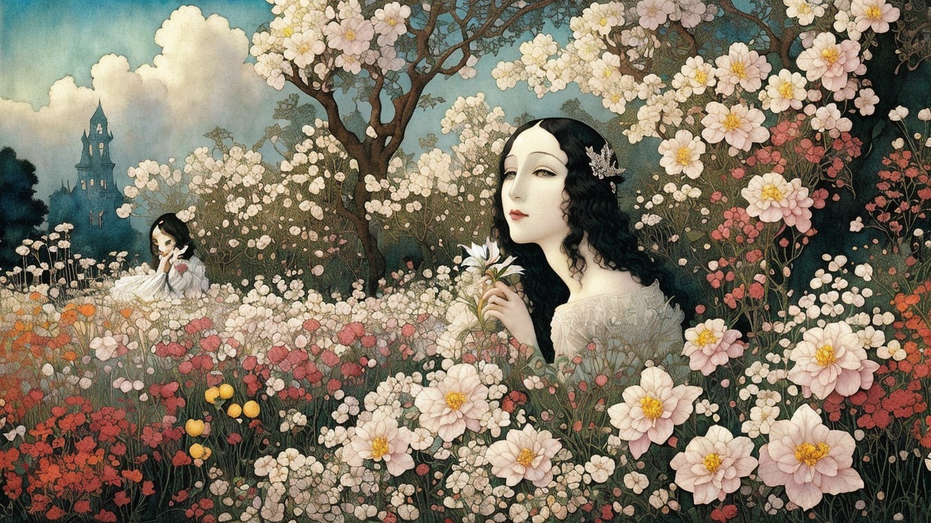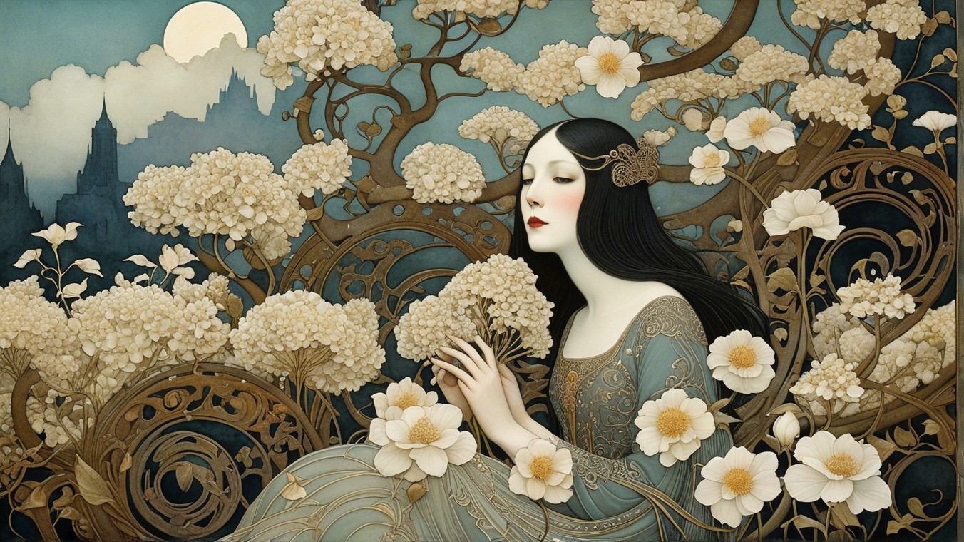 A serene woman in an elegantly flowing gown stands amidst whimsical, oversized mushrooms under a glowing moon, adorned with a floral crown and jewels, exuding an enchanting, ethereal presence.