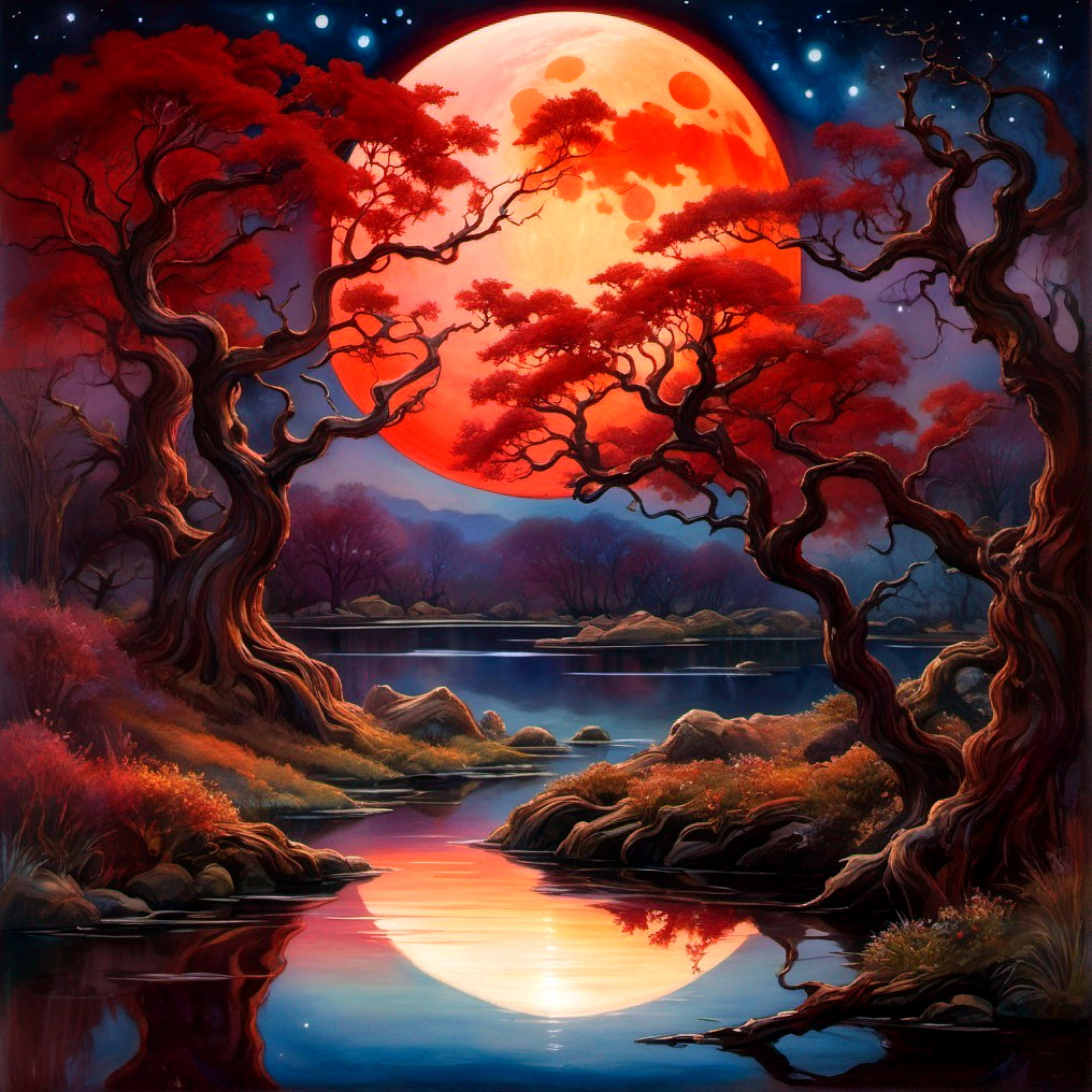A vibrant painting depicts a surreal, red-hued landscape with mirror-like water under a large moon, framed by twisting trees.
