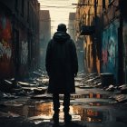 A lone figure in a dark coat stands in a tranquil alleyway, flanked by vibrant artwork on wooden walls, reflecting on the still waters below. The scene evokes a sense of mystery and nostalgia.