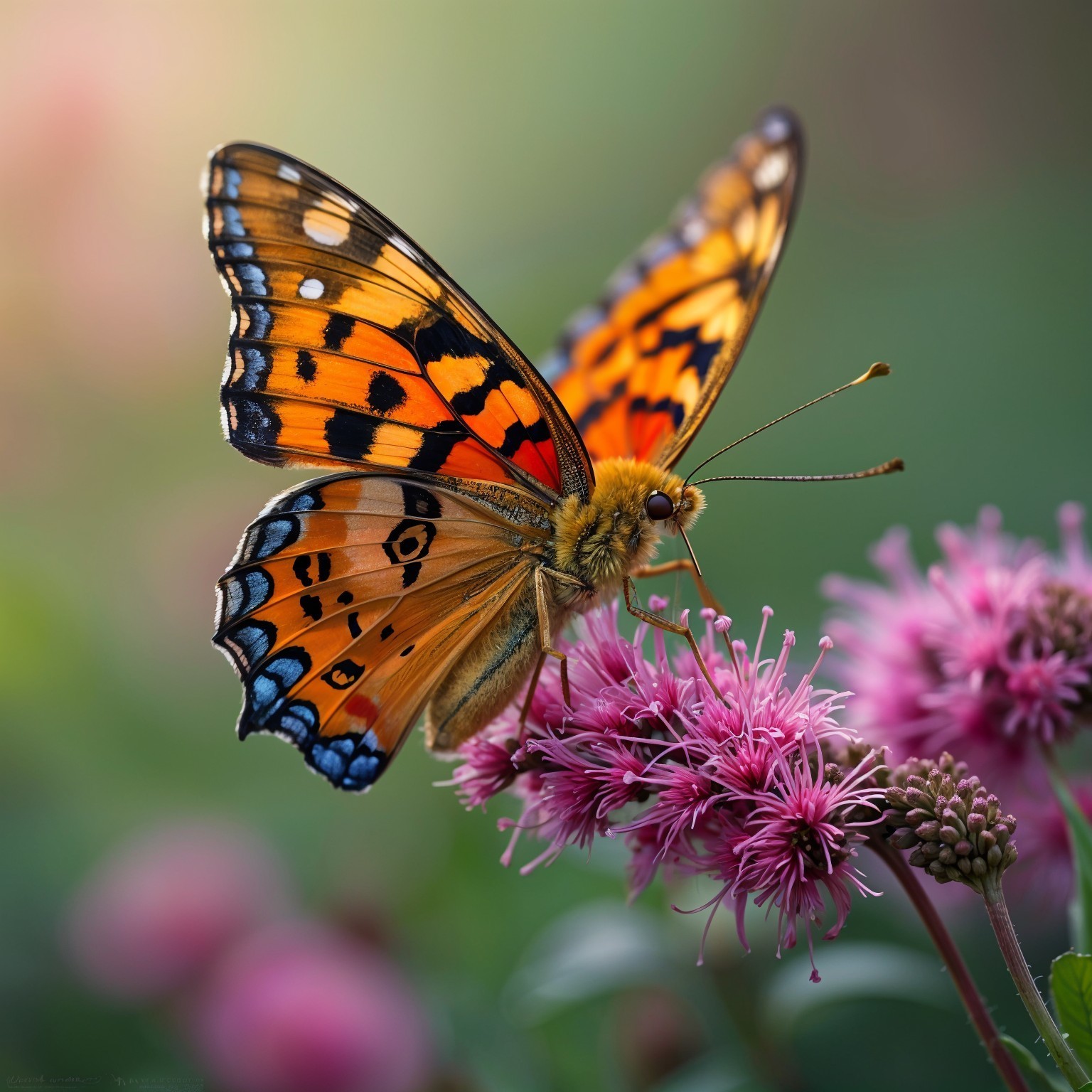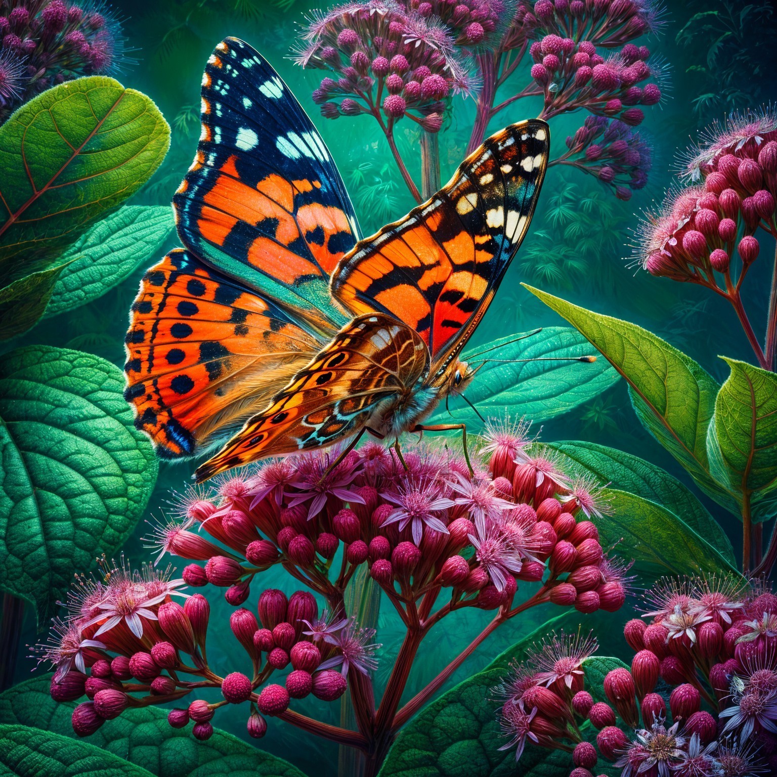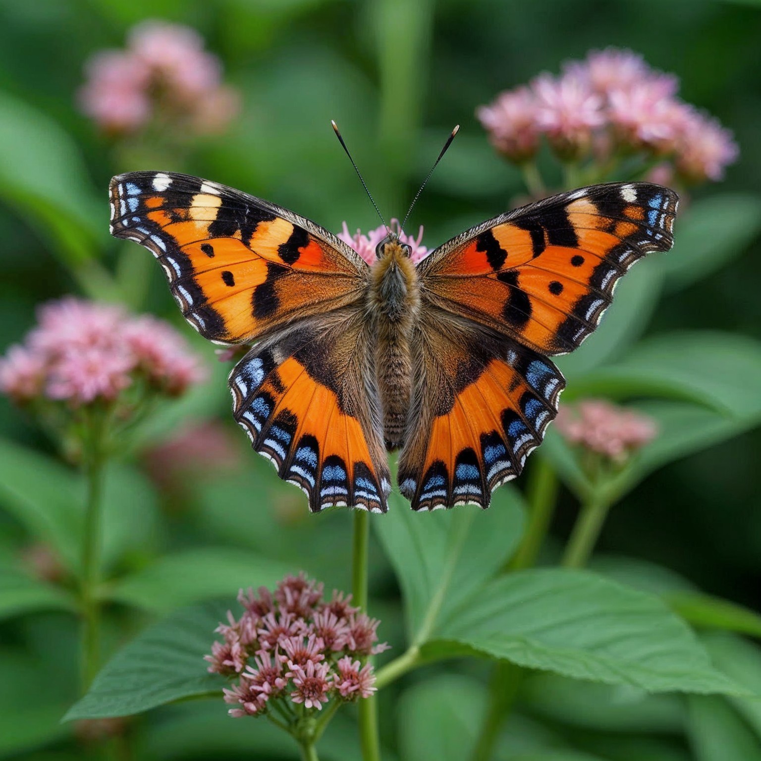A vibrant butterfly with striking orange and black patterns rests on clusters of pink flowers. The lush greenery in the background enhances the serene and colorful scene of nature.