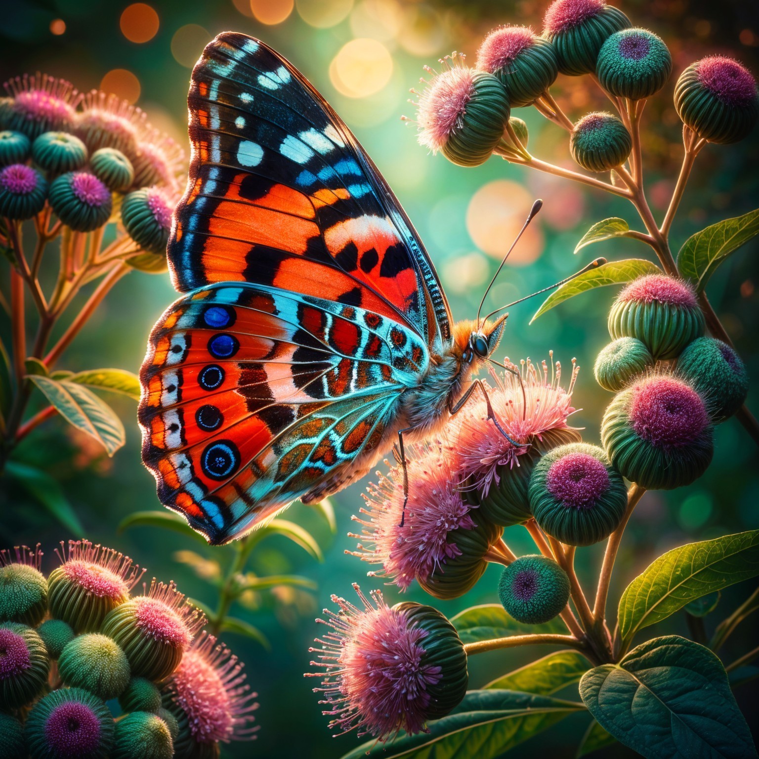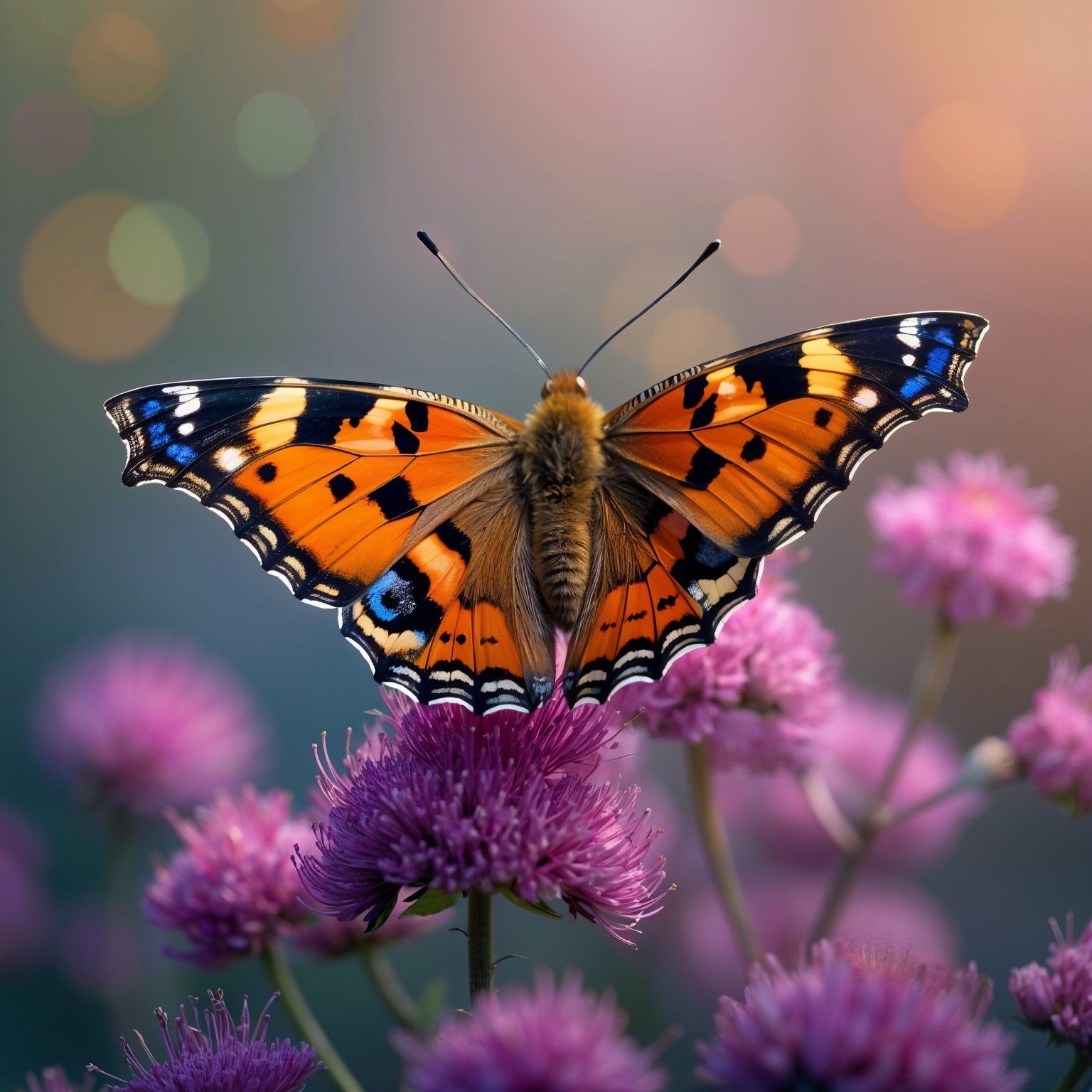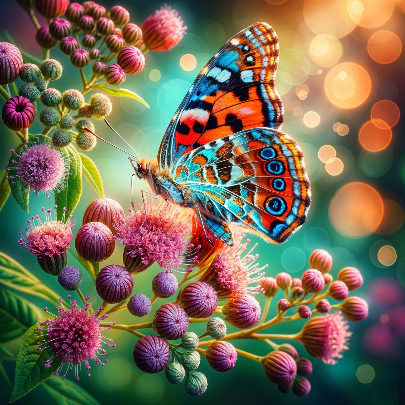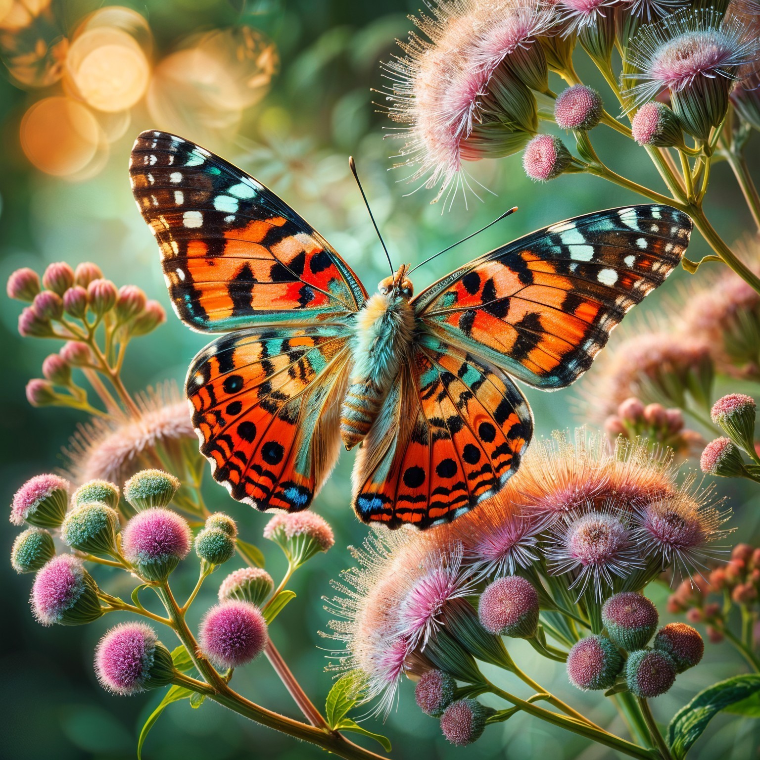 A vibrant butterfly with striking orange and black patterns rests on clusters of pink flowers. The lush greenery in the background enhances the serene and colorful scene of nature.