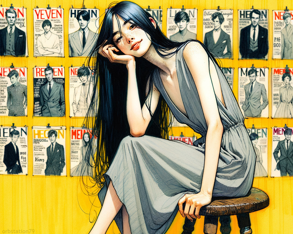 A stylized illustration of a woman with long hair sitting on a stool, against a backdrop of vintage magazine covers.