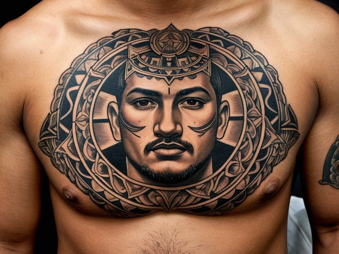 The image features a detailed chest tattoo of a regal man with a mustache and beard, framed by ornate patterns and a decorative crown, showcasing intricate line work and shading.