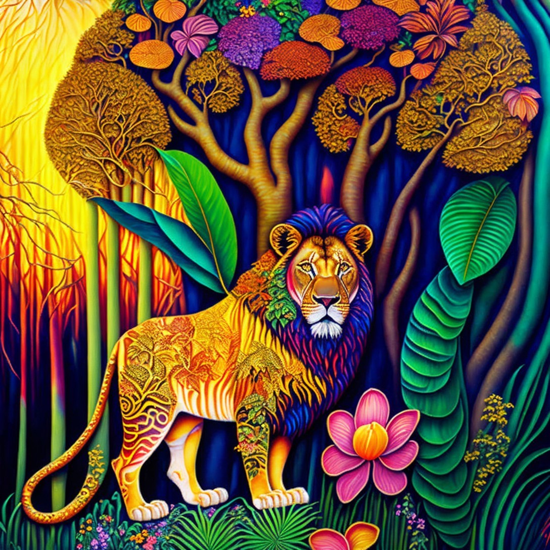 3D acrylic painting of realistic jungle scene with anatomically accurate magnificent lion, trees, plants and flowers, brightly colored in Tingatinga patterns, in golden sunset rays, with elements of the style of Gustav Klimt