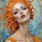 A stunning portrait of a young woman with vibrant red, curly hair, soft features, and a serene expression, adorned in a golden outfit. The background features blue and textured elements, enhancing her beauty. Original Cr Francis