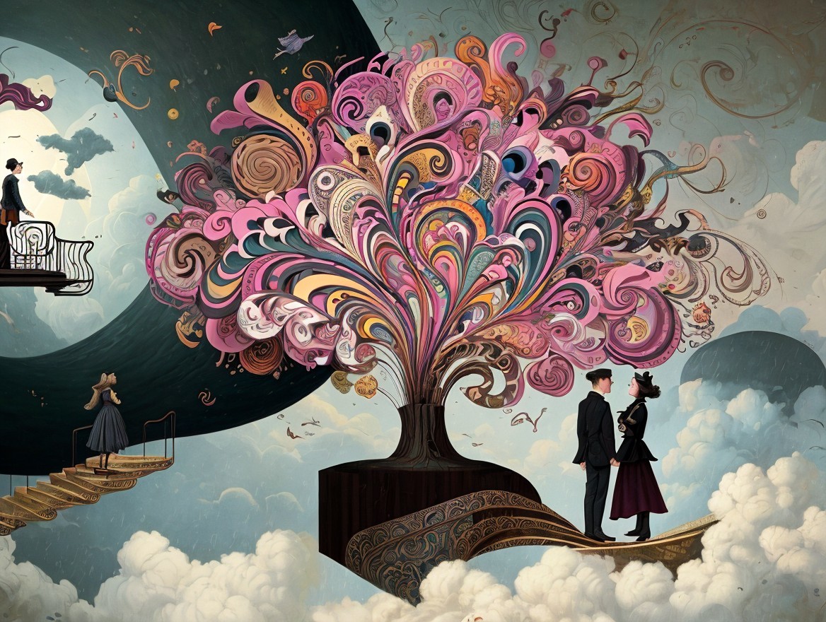 The image features a surreal landscape with twisting staircases, vibrant colors, and whimsical architecture. An expansive planet looms above, creating a dreamlike atmosphere filled with wonder.