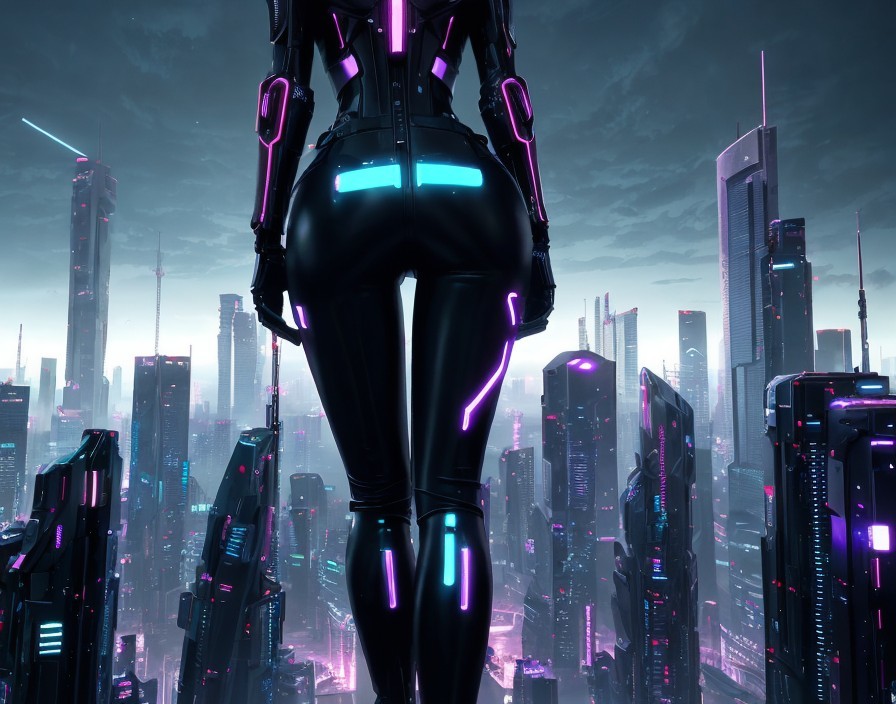 Prompt: "{{Masterpiece anime girl, slender physique, almost no clothing} dual swords strapped to her back} [full frame] [full body portrait] futuristic urban landscape, cyberpunk setting, neon lights, technologically advanced cityscape, sleek metallic skyscrapers, digital art, detailed character design, dynamic pose, long flowing hair, intense expression, glowing eyes, city skyline backdrop, artistically crafted, vibrant color palette, dramatic lighting effects, by Akihiko Yoshida, Artstation."