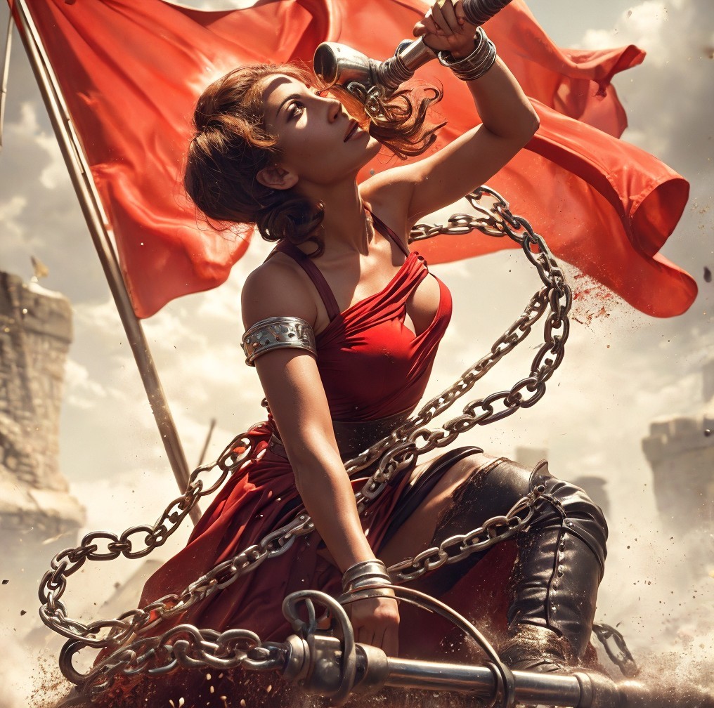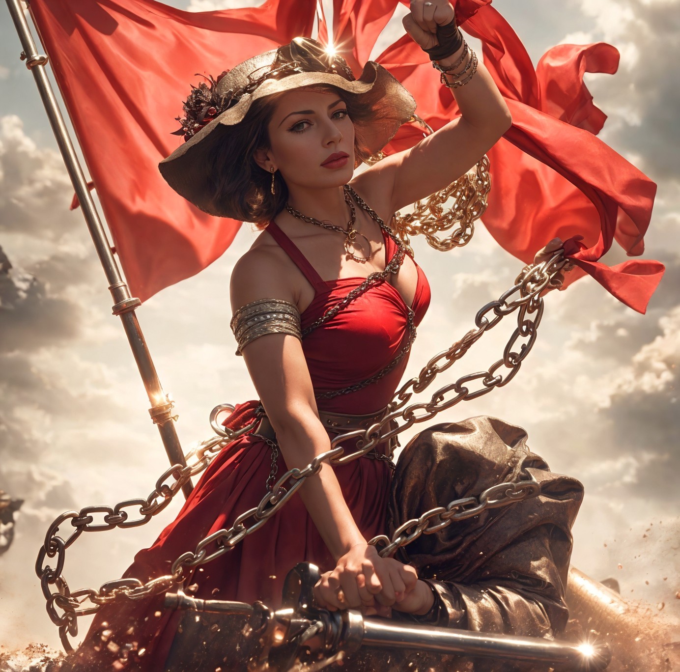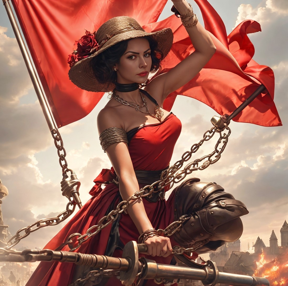 A woman in a red dress and a wide-brimmed hat holds chains, with a billowing red flag behind her under a cloudy sky. The title refers to an old song, as far as I know it was last recorded by Joe Glazer around 1966, "She used to be the main attraction for all the boys in the left wing faction/ Now she's on Park Avenue fighting reaction/ The lady with the popular front...."