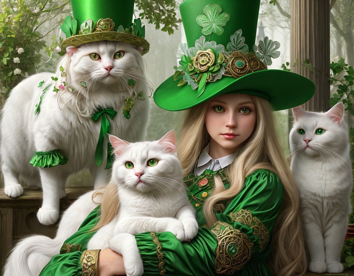 A beautiful woman is sitting with her three white cats. They are all ready for St. Patrick's Day. Creation by constance lowery.