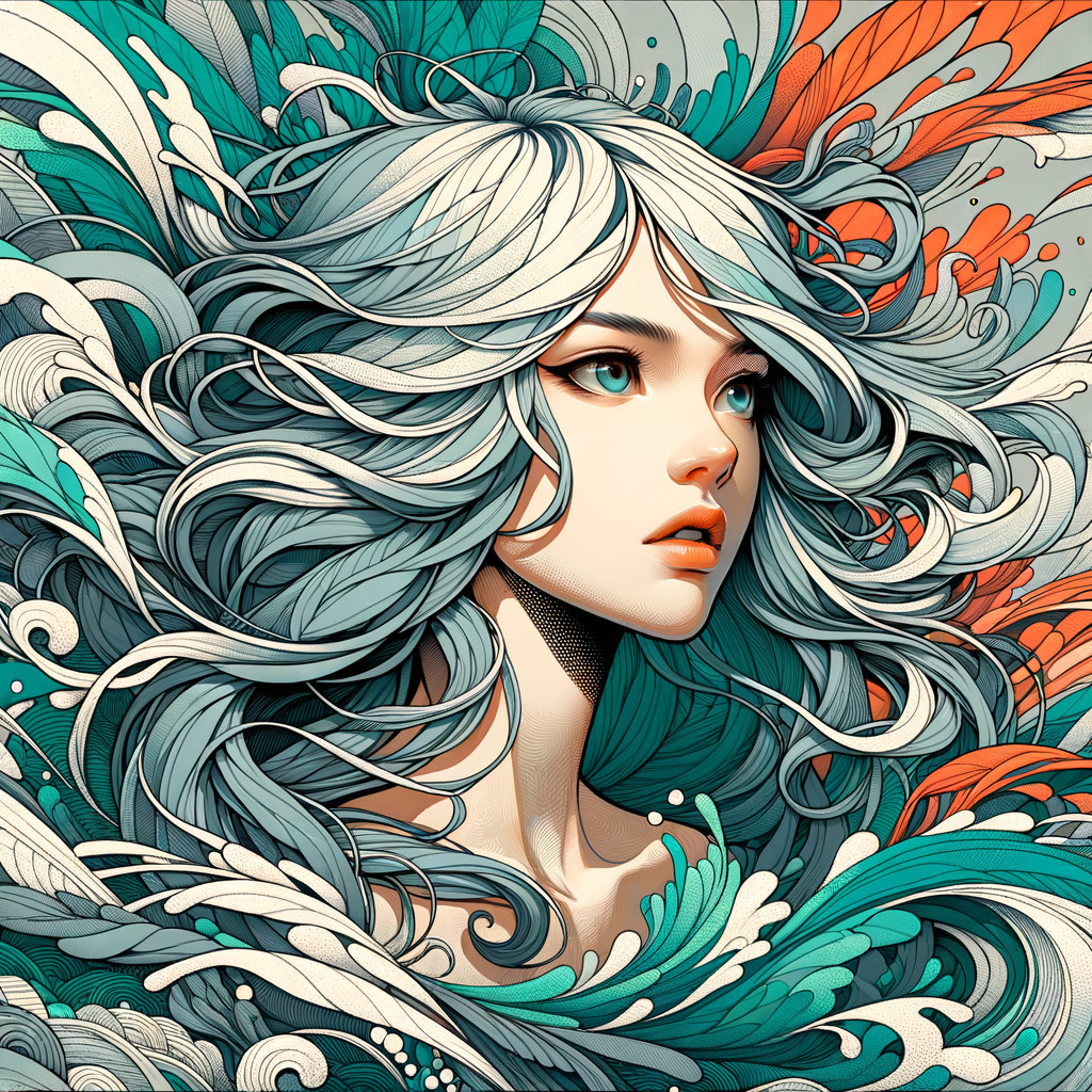 A digital artwork of a girl with flowing silver hair and striking amber eyes against a teal background with orange accents.