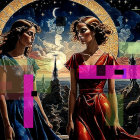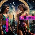 Two women in vibrant, floral swimsuits stand against a dreamy landscape of ocean and moonlight, framed by abstract, colorful geometric shapes and lush foliage.