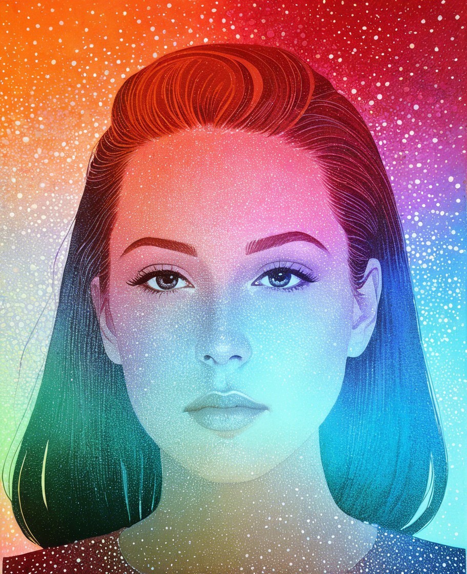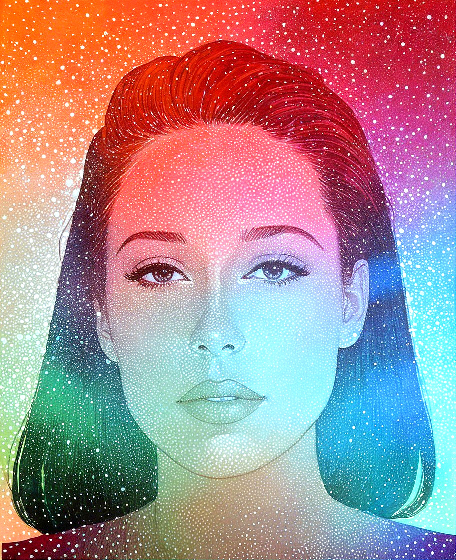 + Prompt:Stylized Headshot, gouache Portraiture with stylized lineage patterns in hair, line-art, double exposure effect, stippled, dynamic lighting 1.2, visible brushstrokes, star speckled background, tesselated, back-lit, retrofuturistic essence, reminiscent of space age style, beautiful composition by barclay shaw, contouring outlines, thickened gouache ,dystopian, joyful face expression, starry textured background with stylized white dots, in triadic color scheme beige blue lilac, tessellated, blueto reddish-brown color palette, filaments, blue to purple hues, brightness1.9, warm tones, hues in edges american gothic 1.7, octane render illustration, vibrant blue, hues by Georgia o'keffee, 3d effects 1.8, ambient occlusion 1.5, raytraced shadows, shadow mapping 1.3 anisotropic filtering 1.7, brightened daguerreotype photography on old paper, glossy accents, fantasy atmosphere, golden ratio, otherworldly cosmical setting, brushed textures, gouache painting, ethereal, rim lighting, blueish iridescent lighting, muscular, dethereal beauty, astronomical objects, streamline_moderne, elegance, regal, warm coloring, stnthetic essence, saturated color palette, swirling, gouache textures, soft rounded edges, celestial background, erotic essence, enigmatic, detailed fantasy, fur and black fabric texture, alert expression, flared nostrils, bark-like nose blending into skin, black tousled hairs, cel-shaded, detailed facial features, close-up portrait, fantasy art,, abstract forms, warm colors, sculpted, fashion photography, hyper-detailed, sharp focus, studio photo quality, uhd hdr, octane render, lighting by Jim Davis, tints of comic book art, sculpted, plasticity 1.3, overall composition by Georgia o'keffee and William Bradley and frank Fazetta,line-art, stylized lineage details, octane render, uhd,hdr, traumacore1.9, minimalistic, illustrative stylization 1.6, complexion 1.2,