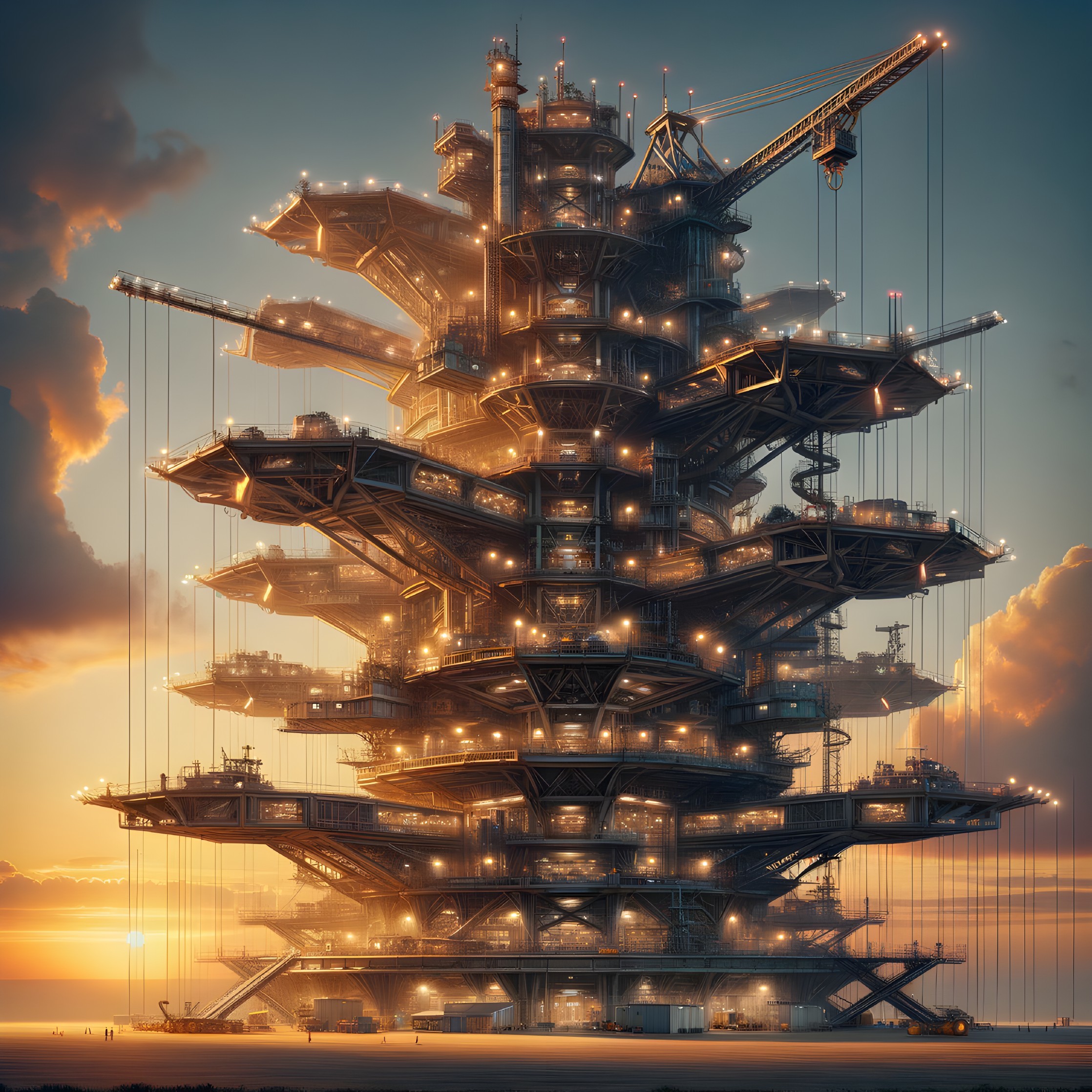 A towering, futuristic structure, illuminated with golden lights, rises against a sunset sky, adorned with cranes and intricate architecture.