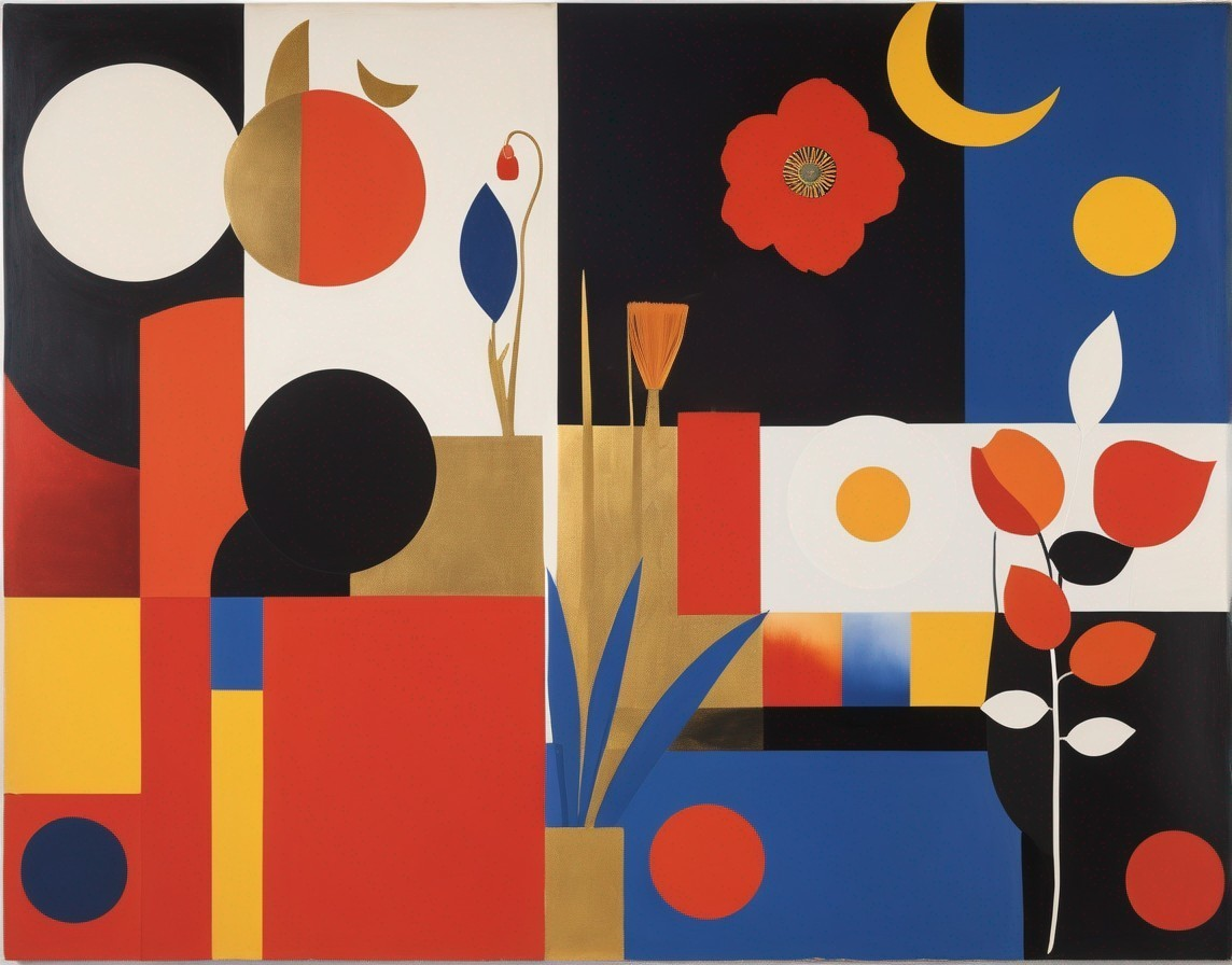 Colorful abstract geometric art with circles, triangles, and curving shapes against red, black, white, and blue backgrounds.