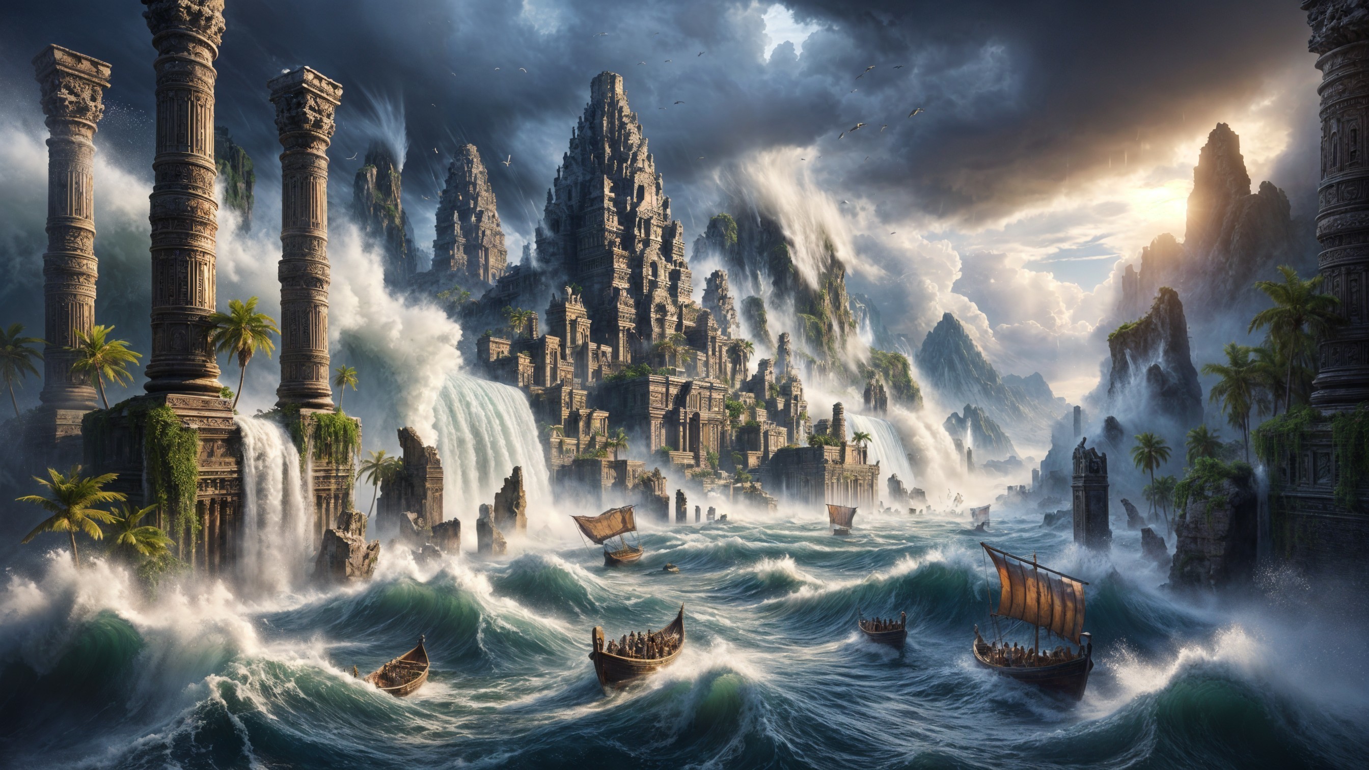 Prompt: "Create a dramatic and immersive scene of a vast, sunken ancient city of Atlantis being engulfed by massive tsunami waves. In the foreground, depict towering, intricately detailed stone structures with crumbled pillars and broken statues, indicative of a once-great civilization. The city should be partially submerged, with turbulent water crashing against the ruins, sending sprays of mist into the air.