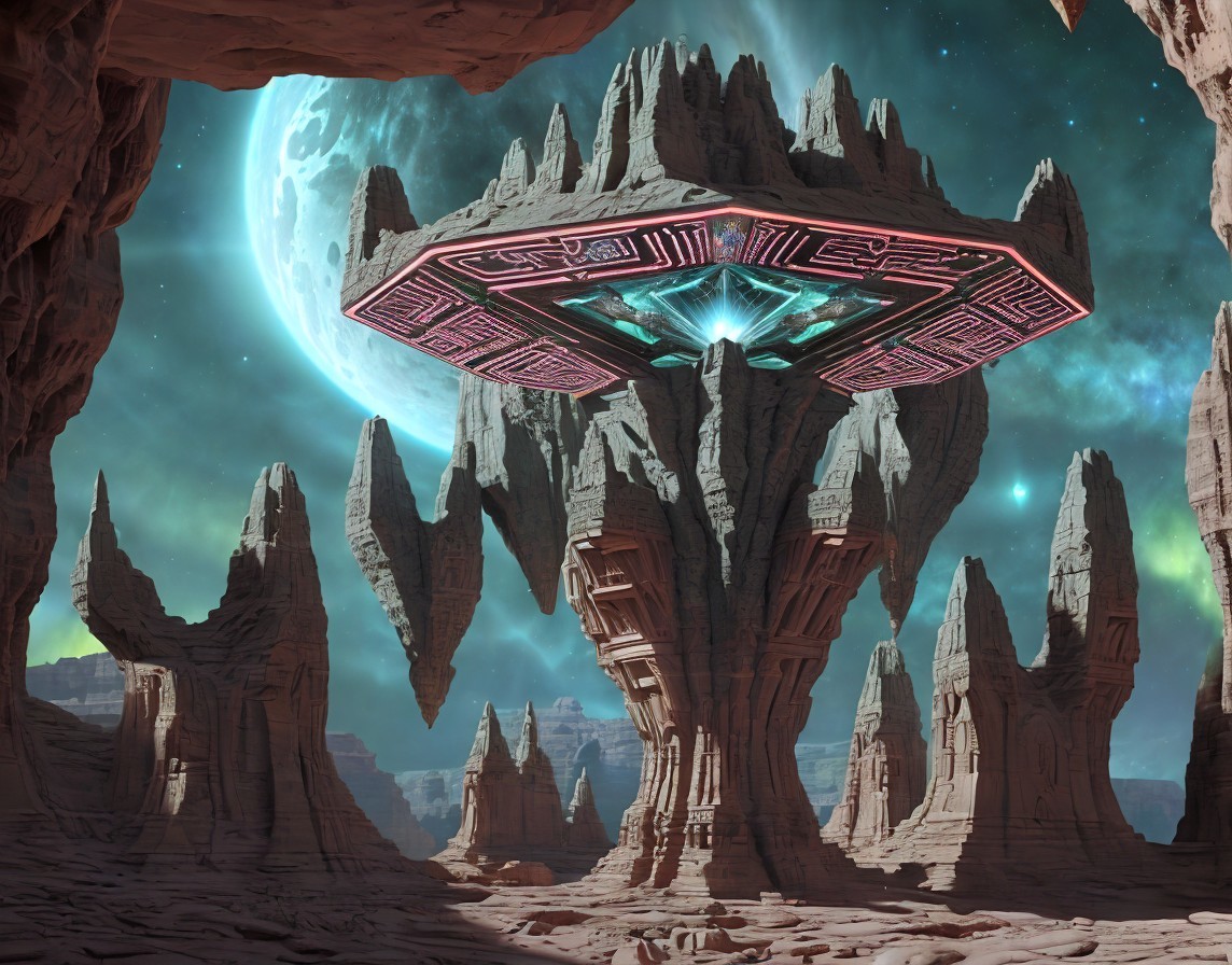 + Prompt:Surreal high-tech alien temple similar to Petra adorned with intricate geometric patterns. Petra-like temple, Extraterrestrial temple assimilated with advanced alien technology in a cosmic landscape. Planets and nebula. Sacred geometry. Dynamic landscape with massive ravines and canyons. large, jagged, phosphorescent crystals. Magical crystals. sacred geometry, mystical, Realistic and natural elements, In the style of Cameron Gray
