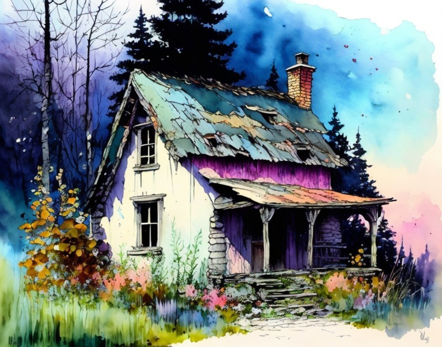 A quaint cottage amidst a forest with colorful soap bubbles adding a whimsical touch to the serene landscape.