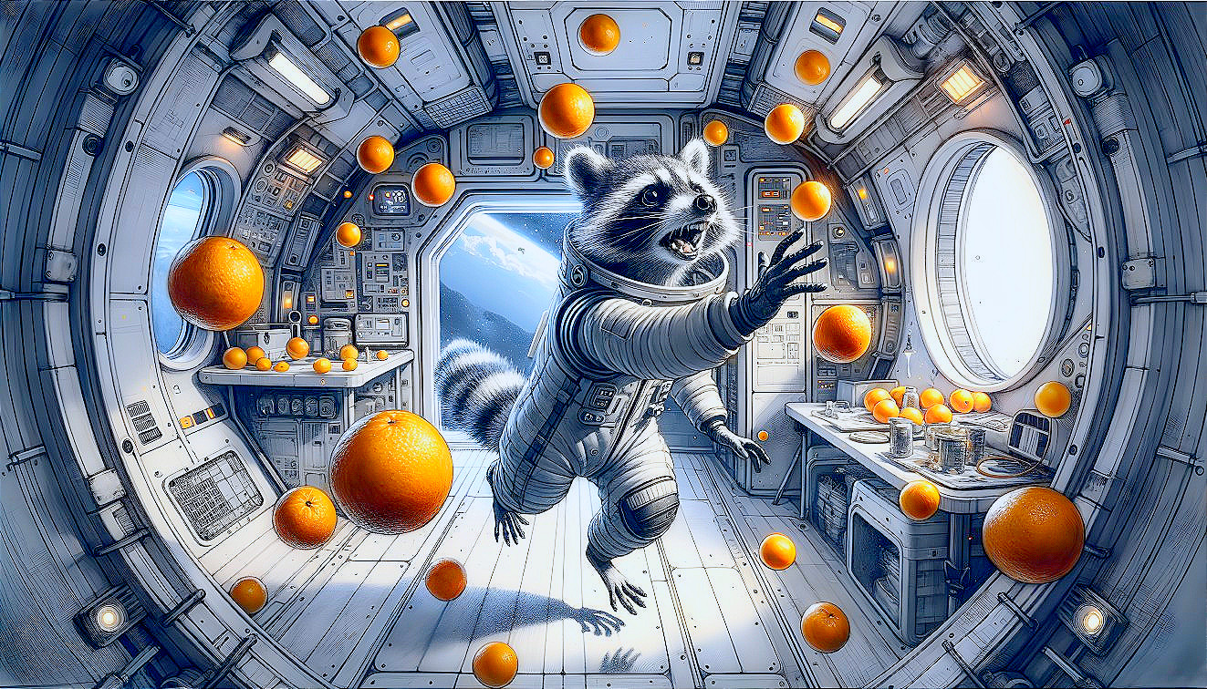 A playful raccoon in a spacesuit floats in zero gravity inside a spaceship cabin, reaching for oranges with its paw. The scene is highly detailed, photorealistic, and rendered in various artistic styles like watercolor, ink splash, and pencil sketch.