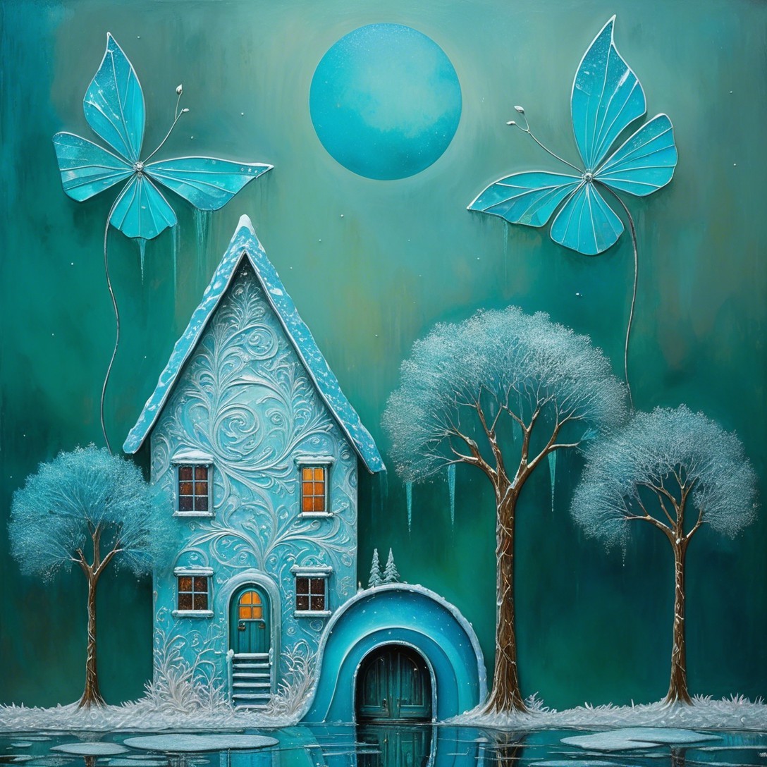 An enchanting, stylized painting depicts a snow-covered house and landscape in various shades of teal and blue with hints of golden light. The tall, ornate house, located centrally, is a vibrant teal-blue with intricate white swirling patterns embossed on its walls, suggesting an icy, frosted texture. Its steeply