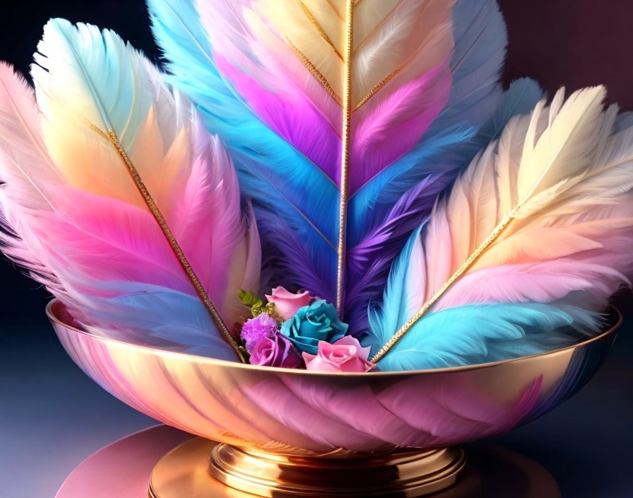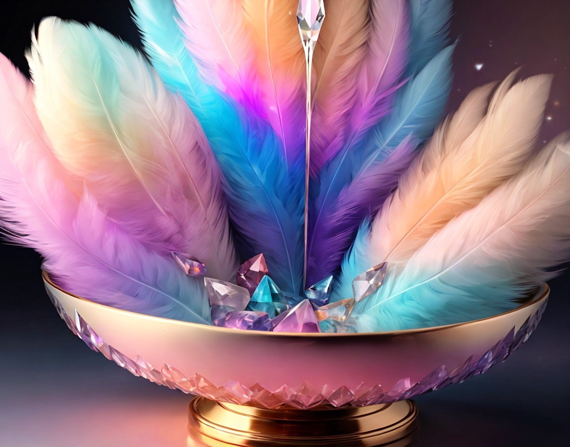A collection of colorful feathers arranged in a geometric crystal bowl with a golden base, set against a soft gradient background.