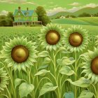 Serene landscape with sunflowers and a vintage house