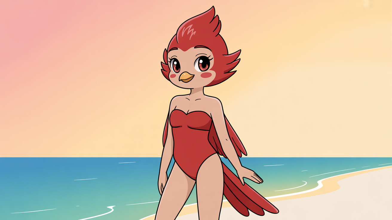 A charming anime character in a vibrant strapless swimsuit, featuring playful colors and a cheerful expression. The design highlights a fun summer vibe, perfect for beach or poolside adventures.