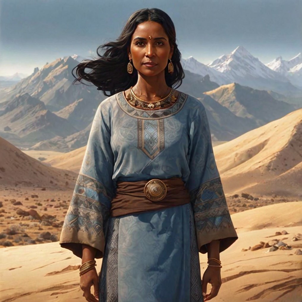 Prompt: A scene from the Bronze Age. A full body representation A woman (36 years) with a desert and mountains on the horizon in the background. She has dark hair and mocha-colored skin. She is dressed in an ankle-length, gray-blue patterned tunic.
