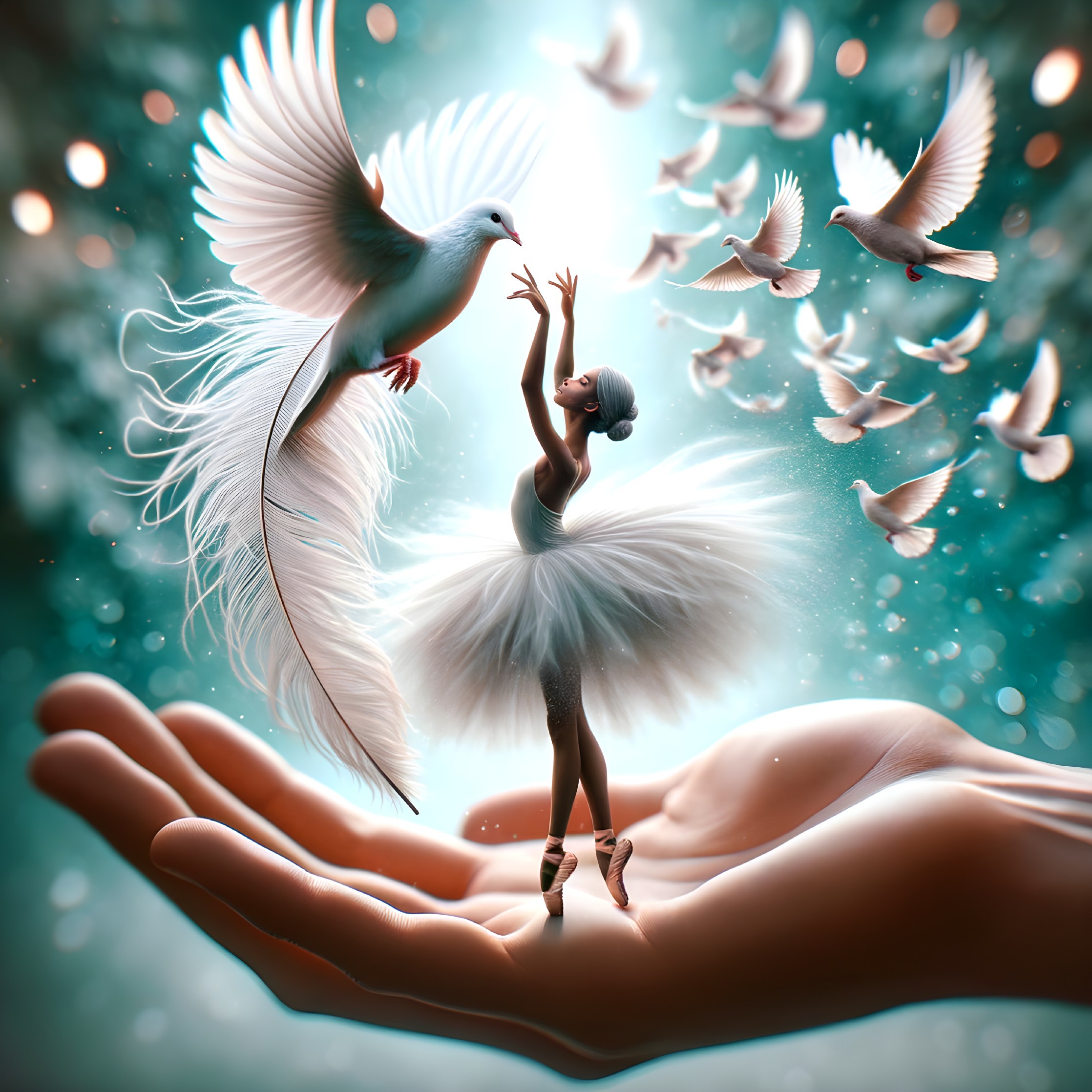 A ballerina dances on a palm, reaching towards a radiant dove among a flock, all set against a bokeh light backdrop.