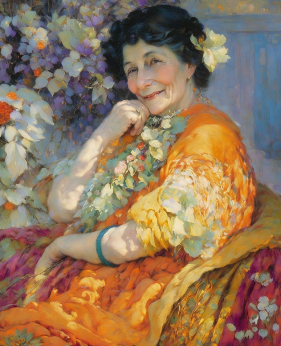 A joyful woman with curly hair adorned with a flower wears a vibrant, multi-colored outfit. She smiles warmly, seated amidst a backdrop of colorful flowers and a serene landscape.
