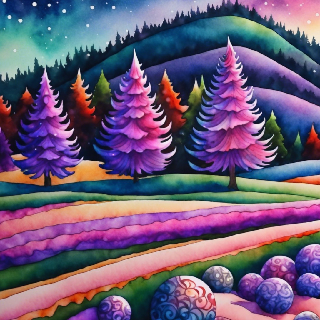 A vibrant watercolor scene showcases colorful trees on rolling hills under a starlit sky. Decorative, patterned orbs rest on the foreground, enhancing the whimsical atmosphere of the landscape.