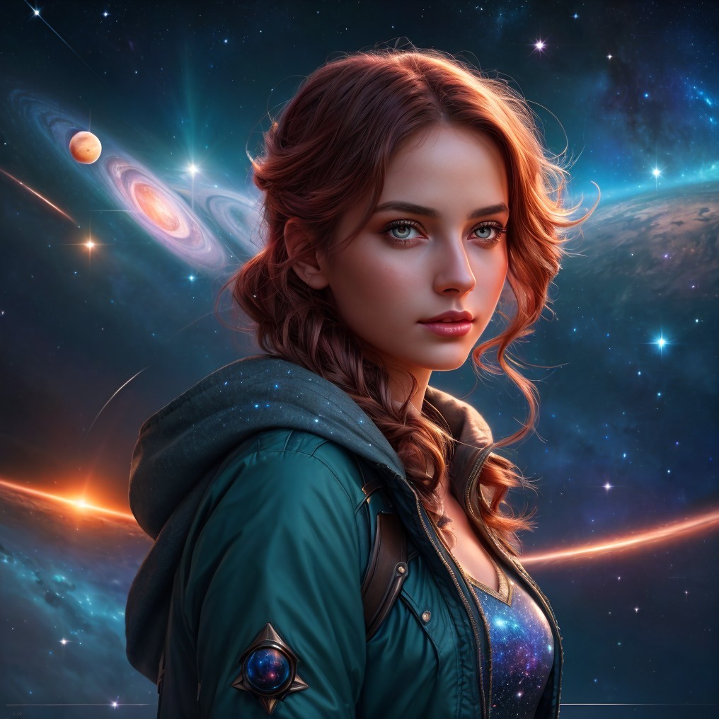A digital portrait of a woman with deep blue eyes and wavy hair, set against a cosmic backdrop with stars and galaxies.