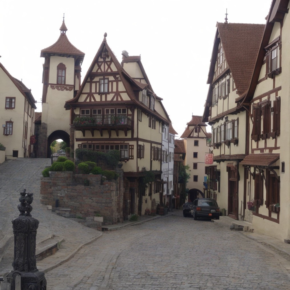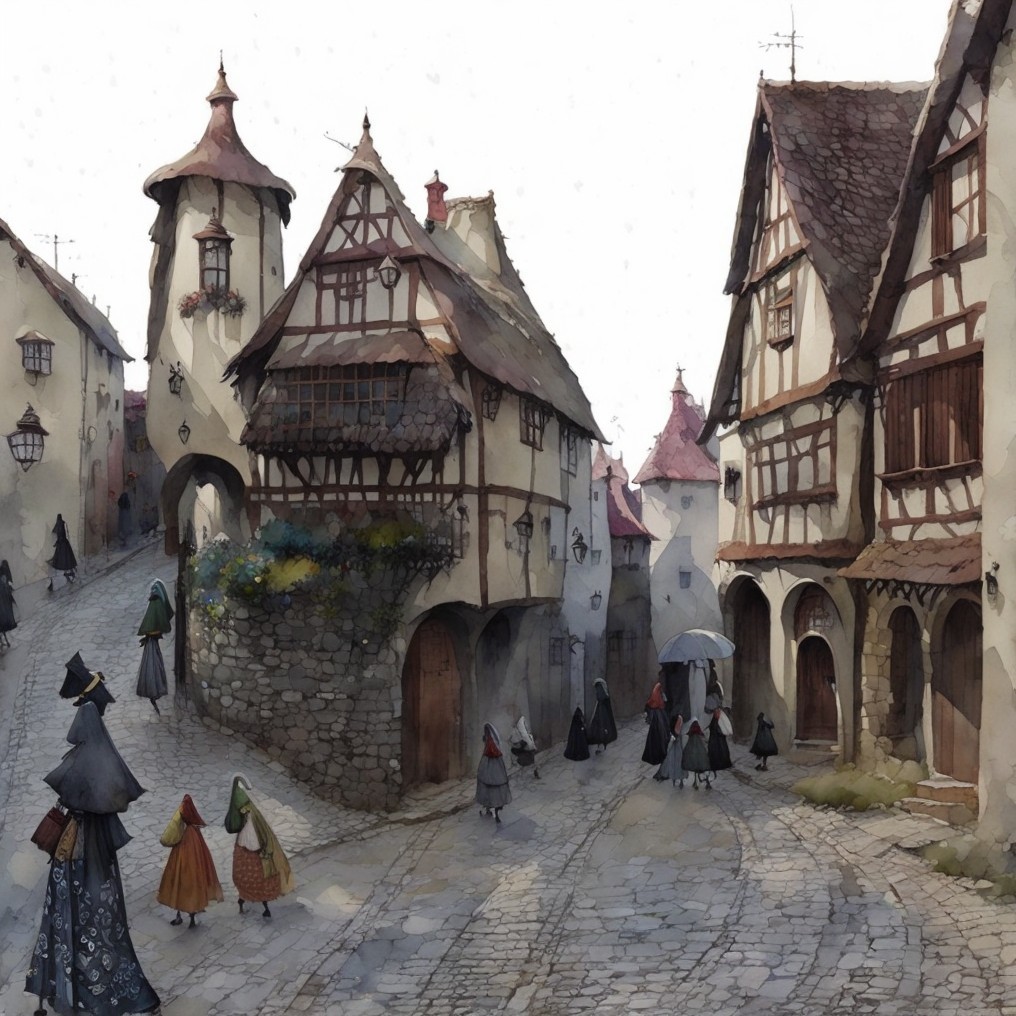 A painting of a bustling medieval village street with half-timbered houses and townspeople in period attire. From my own image.