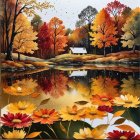 A serene landscape depicts a cozy cabin by a lake surrounded by vibrant autumn trees. Colorful lotus flowers bloom in the foreground, reflecting the stunning mountains and autumnal hues.