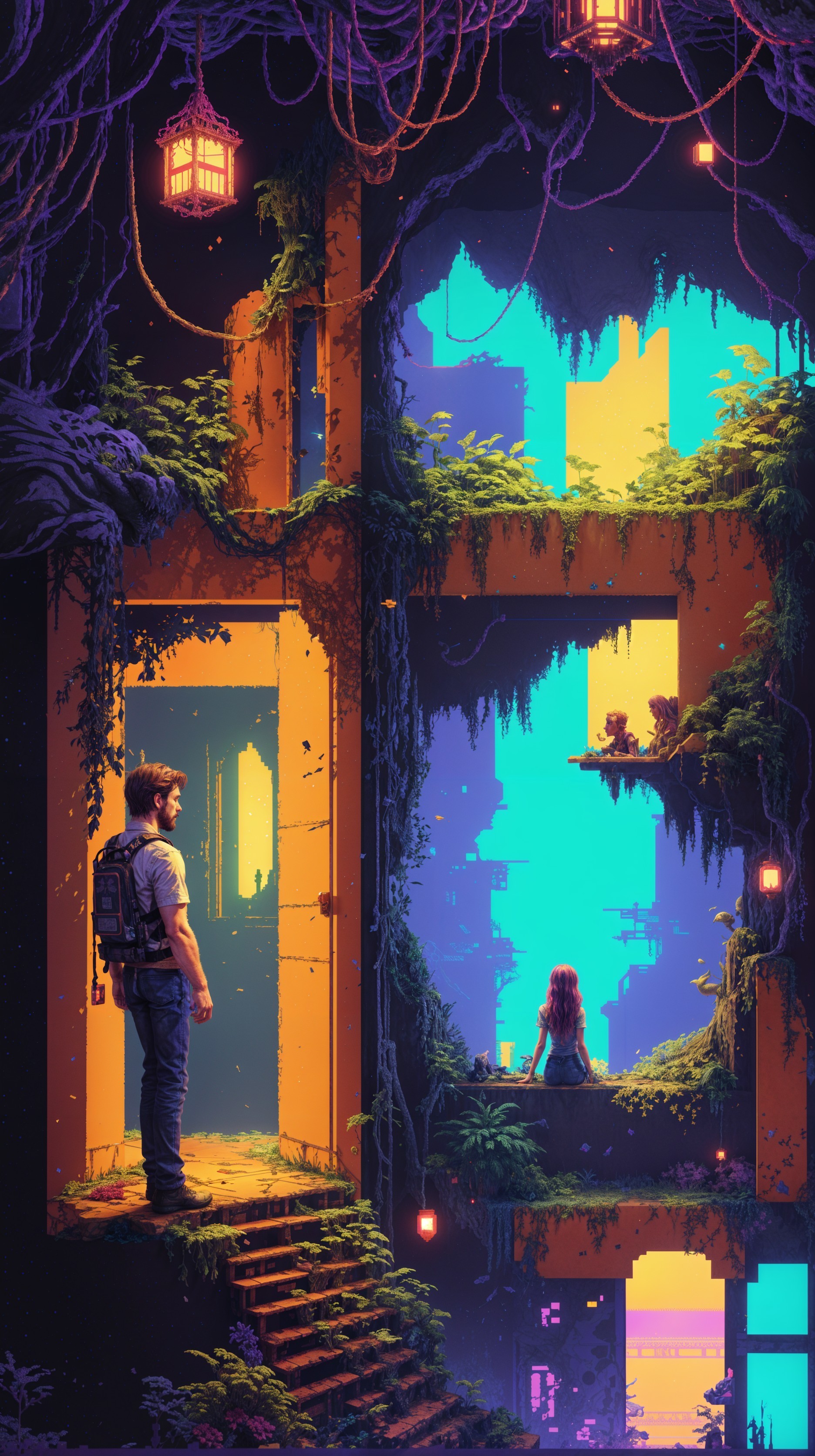 In a vibrant, overgrown setting, a young man stands before a door, gazing at a girl seated on a bed. The scene blends nature and urban decay, illuminated by colorful lights.