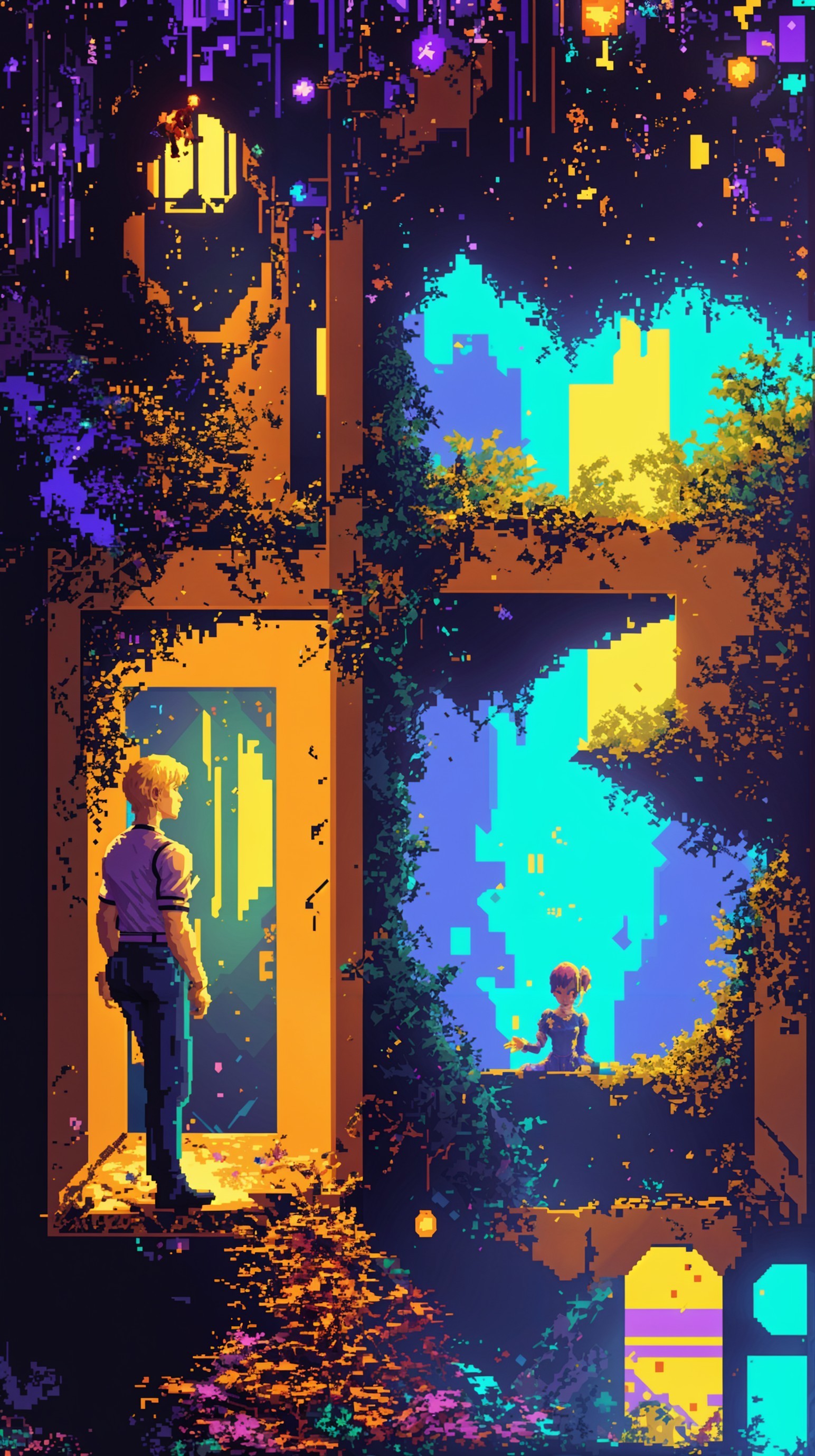 "Pixelated Robert Crump dreams of Lovers trapped in a glitching 8bit lost world, video game", vulnerable characters, digital setting with pixelated bedroom, mysterious openings into abandoned parthways, magical futuristic elements, lights glowing, psychedelic yet dark environment, tangled wires, immersive atmosphere, dynamic posing, detailed character design, captivating narrative, emotional depth, high resolution, vibrant moist colors, dramatic lighting, acid spill, Dutch pure, George Orwell's 1984
