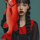 {NAME} with long black hair in a braid, holding a large red fish by the tail, greenish-blue background with a moon in the sky, {NAME} has pale skin, dark lipstick, and is wearing a dark shirt with a red collar, realistic style, fish has detailed scales and a slightly open mouth, {NAME} has a neutral expression, soft lighting, calm and serene atmosphere, night scene, moonlight reflecting on the water, {NAME} is centered in the frame, realistic textures on the fish, {NAME} has a slender neck, {NAME} has a small nose, {NAME} has dark eyes, {NAME} has a calm expression, realistic fish, water in the background, high quality art, fine details, realistic shadows