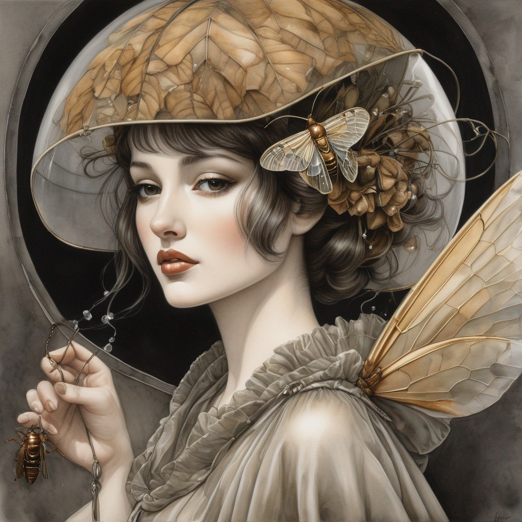 An ethereal artwork of a woman with butterfly wings and a wide-brimmed hat, exhibiting an air of fantasy and elegance.