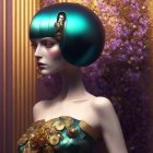 A surreal portrait featuring a woman with an ornate headpiece, adorned with two small cats, and a majestic purple cat looming behind her, set against a backdrop of golden patterns.