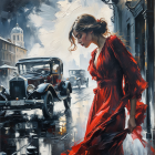 A woman in a flowing red dress stands elegantly on a rain-soaked street, gazing down as vintage cars pass by. The scene is illuminated by warm streetlights, creating a nostalgic atmosphere.