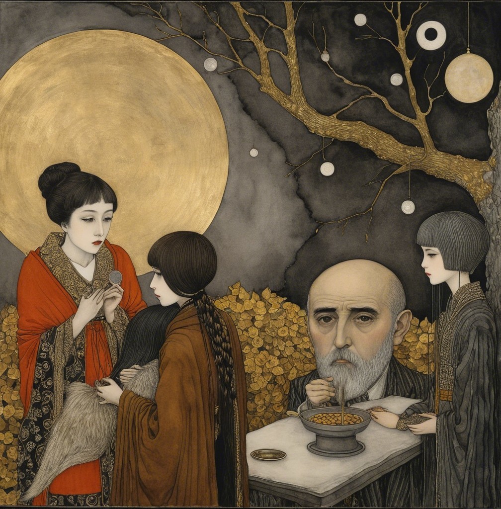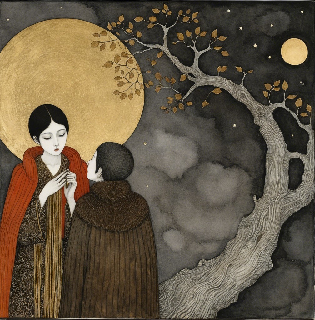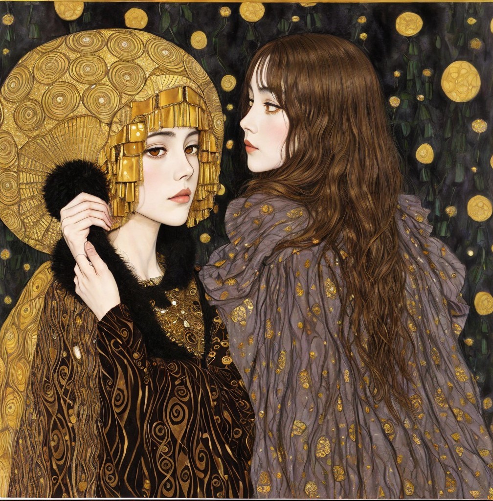 The artwork features two elegant women in intricate garments, set against a dark background with golden circular motifs. One holds a round object, while their gazes convey a deep connection.