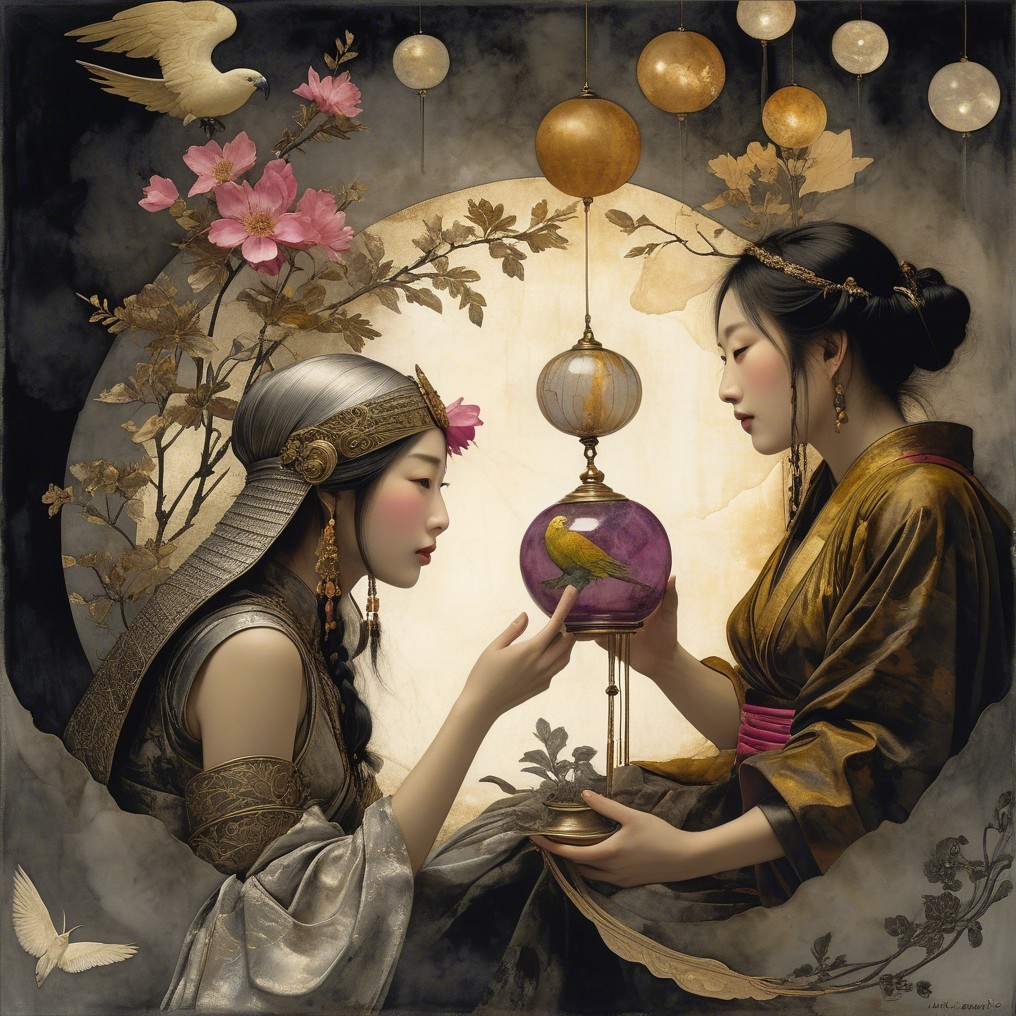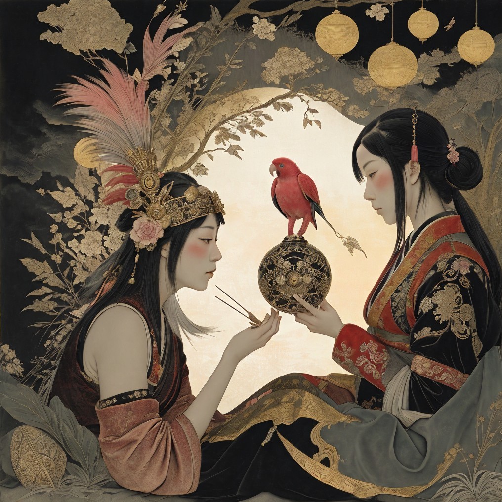 Legend of the Girl and the parrot, Medieval Japanese Artists Sumi-e Style, Velvet blush fuschia, Shabby, Dull Gold, Amber Gray, marbled. dramatic