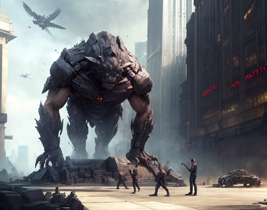 A painting depicting children in a plaza with Mondrian-style buildings, a blooming tree under a vast sky.