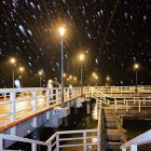 A serene night scene captures a long pier extending into the water under a dark sky, illuminated by warm orange lights. Snowflakes gently fall around the multiple people on the pier, some of whom are wrapped in blankets as they gaze out at the water or stand on various levels of the multi-tiered structure