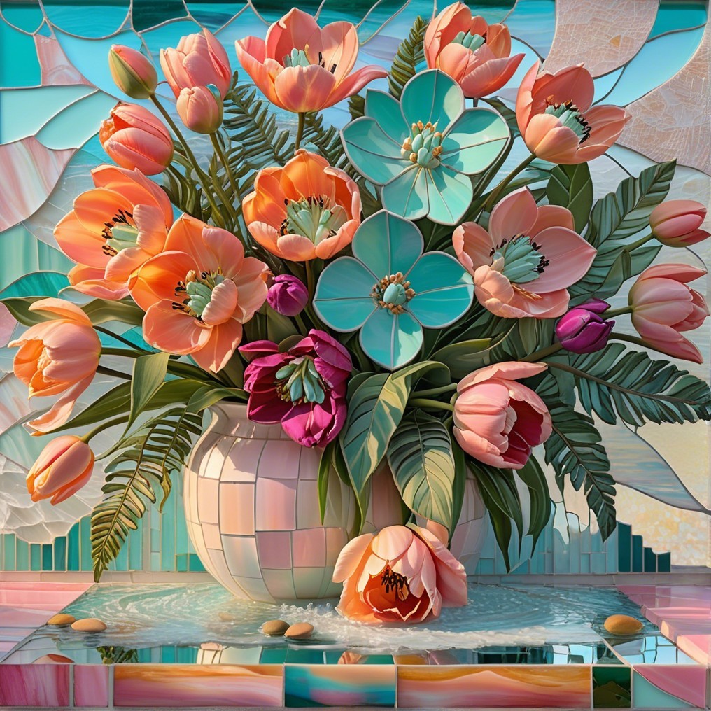 A vibrant bouquet of various flowers, including tulips and orchids, is artfully arranged in a white vase. The background features colorful stained glass patterns, enhancing the floral display's beauty.