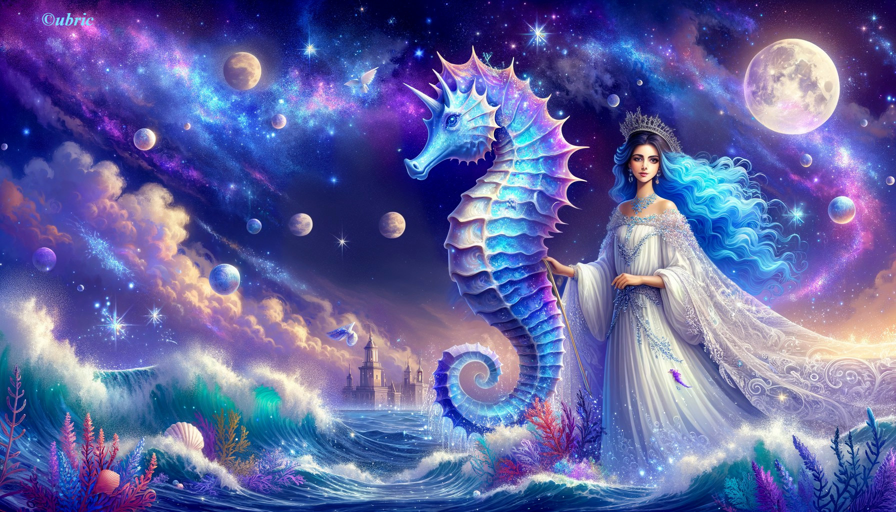 A fantastical scene with a woman in regal attire beside a sea dragon under a starry, moonlit sky with celestial bodies and a distant castle.