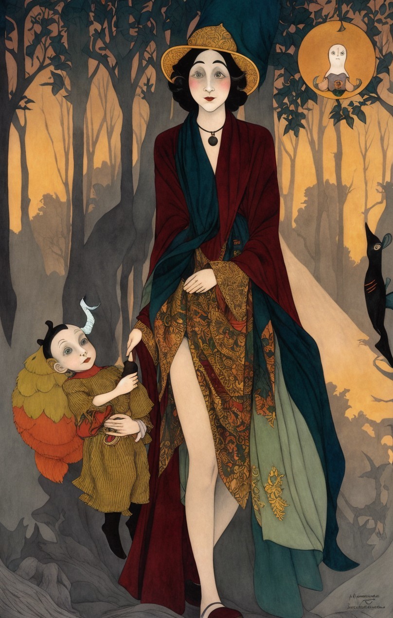 An elfin character in vintage attire stands by a castle with a pumpkin and a fox under a large yellow moon.