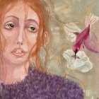 A striking portrait of a woman with fiery red curls and intricately designed feathered wings, gazing serenely at a hovering hummingbird amidst soft, abstract background patterns.