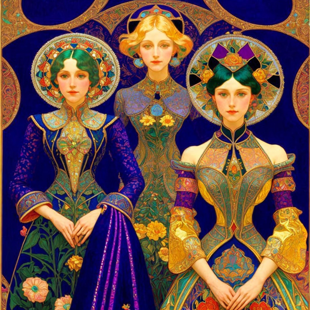 An ornate illustration of three women in elaborate period dresses with stylized floral backgrounds, blending Art Nouveau and fantasy elements.