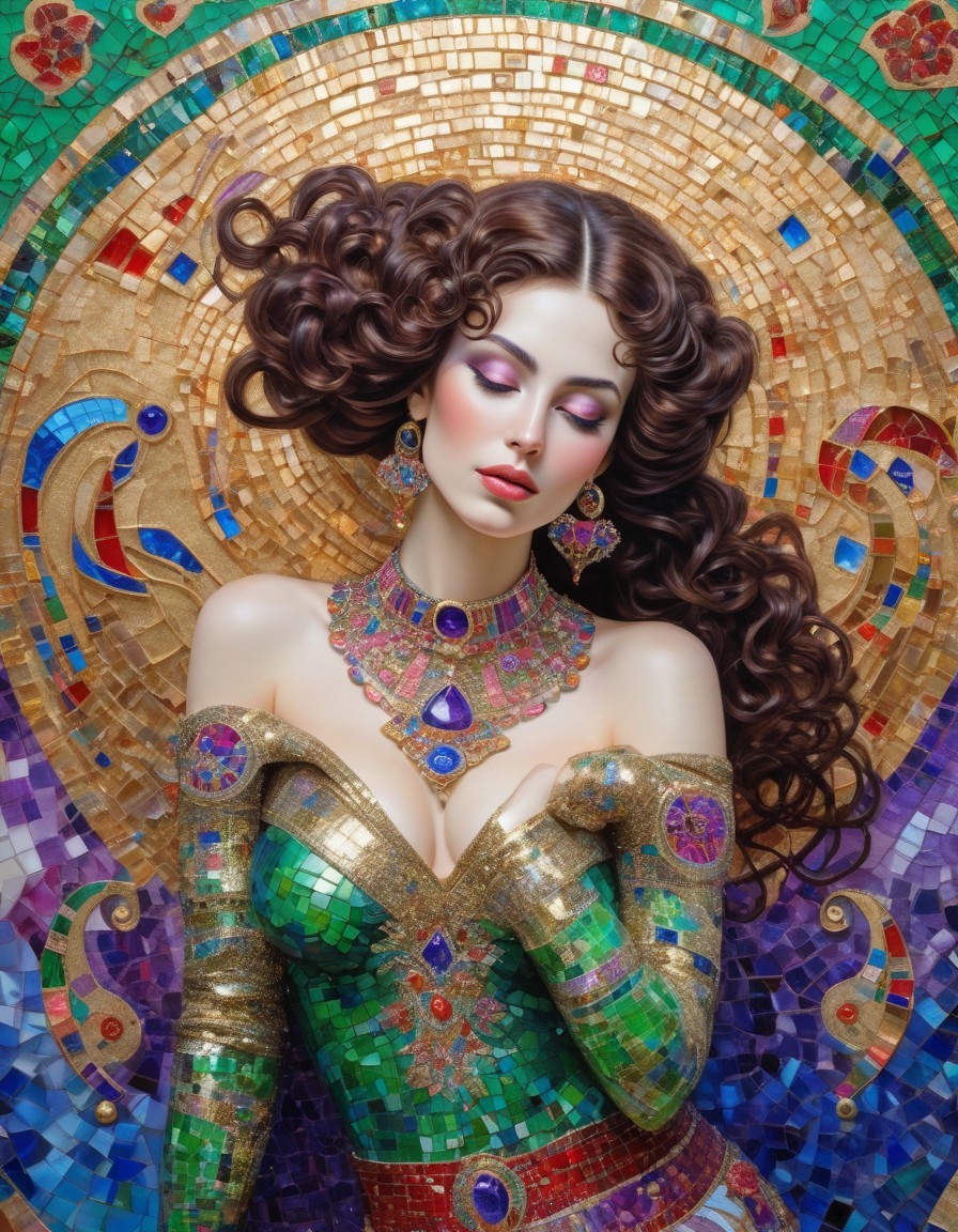 An illustrated woman with flowing hair against a mosaic background, clad in a vibrant, embellished dress, exuding an aura of elegance and mystique.
